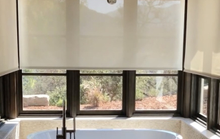 For this sophisticated bath design, we installed Lutron Palladiom Wire-Free Roller Shades, featuring a sleek Black Anodized Palladiom Hembar and Brackets. These shades are seamlessly integrated into a RadioRa3 system and programmed to function effortlessly through a Sunnata Keypad, combining modern aesthetics with intuitive automation.